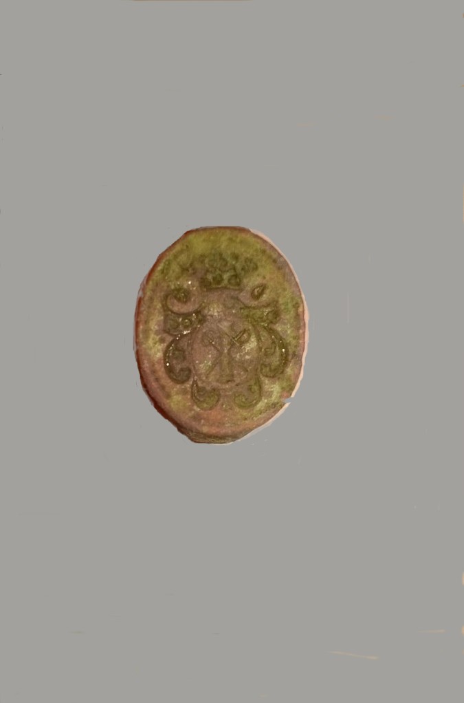 в центре перекрещеные шпага и ключ по середине горизонтально свиток,мне так кажется Петровского времени т.к. в обиходе шпага пришла с его правлением,можнт кто чего подскажет ссылку кинет где посмотреть?
