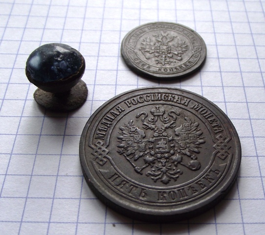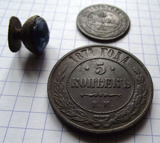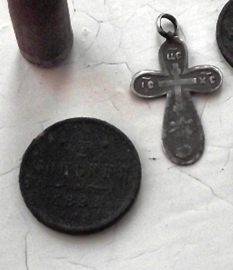 В прошлом году на домовой яме попался этот крестик и монетка.Дом большого размера и рядом с церковью.Вбил себе в голову,что здесь жил священник.Решил сегодня "пошевелить" фундамент.Результат-пятак хорошей сохранности,копейка,пуговица.Сопутка с десяток кованых гвоздей,черепки горшков и целый лошадиный скелет с черепом,наверное в Гражданскую закопали.Пошурфил только два угла и не очень глубоко-на 3 штыка.