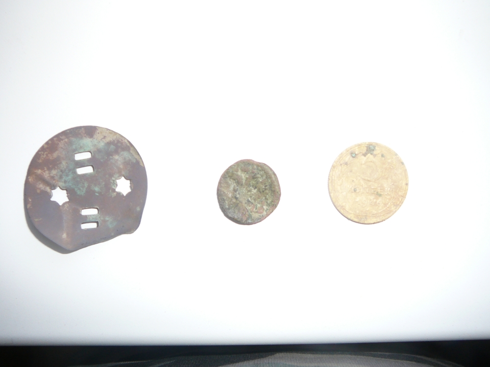 Вот, первые более менее значимые находки. В середине полушка. Копал в двоем с сыном, так что вся "слава" делится пополам :)... Спасибо "Складню", за его чутье на место и"Ешке" и Андрюхе Прости Анндрюха, забыл как тебя на форуме кликать) за компанию.