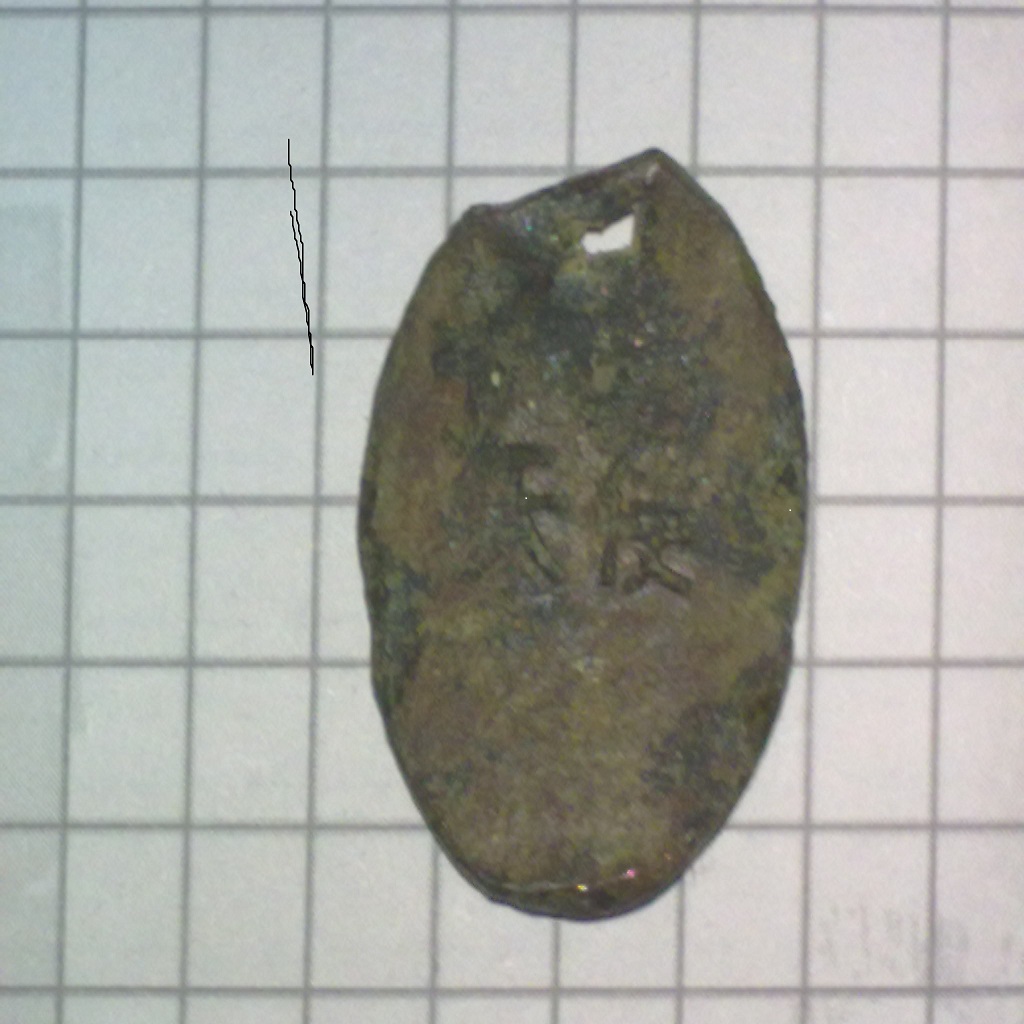 Как версия: то монетка-медальон. Внешне с виду старая, дырка квадратная значит бита гвоздём (либо бедный был, либо уже на чужбине). С дыркой (носил на шее, значит была дорога) но не из драг. мет. (снова-же бедность). Вывод: приезжий слуга-китаец или циркач обранил. А на счёт китайского это к Читинским поисковикам, наверняка разберутся.
