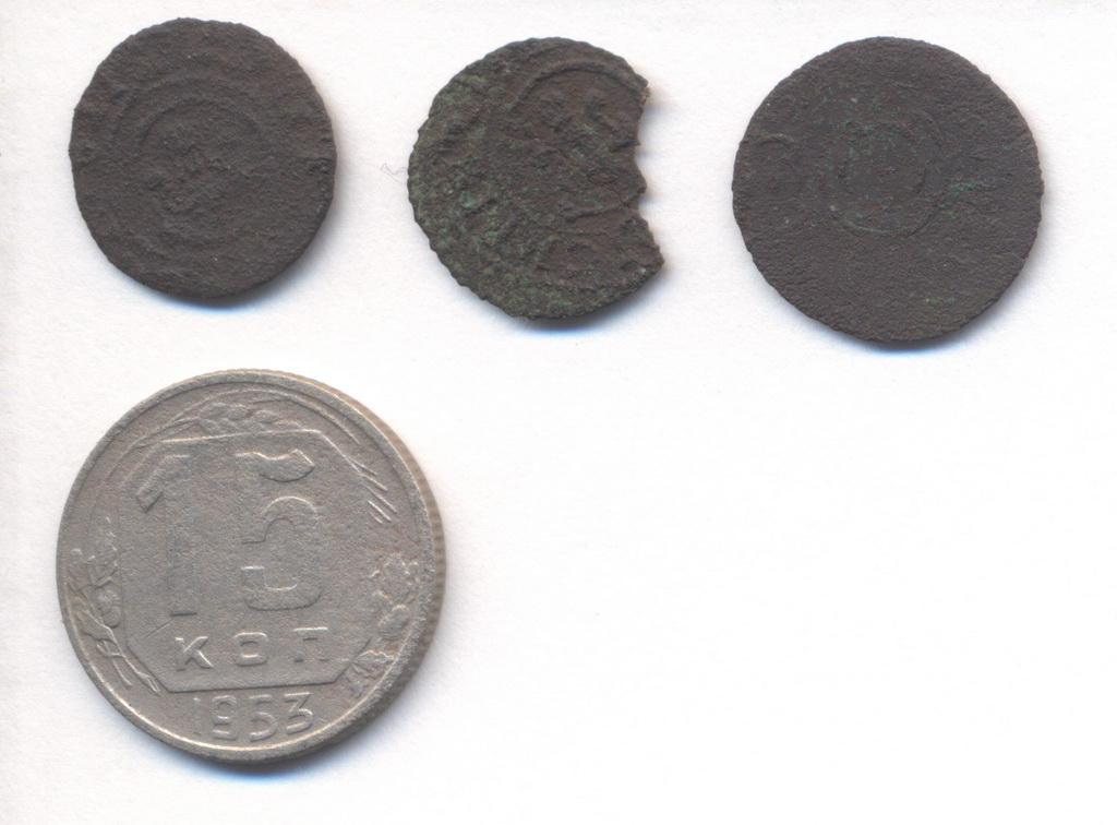 Еще одна моя находка. Монеты конечно очень убитые, но для новичка приятно))). Пятнашка для масштаба. Не пойму только почему не попадается не одной монеты царской России. Беларусь (в крайнем та часть в которой я живу) вошла в состав Российской империи после 1 раздела РП еще при Екатерине II...