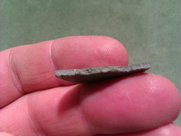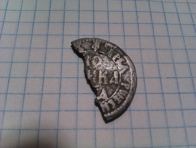 Регион Калужская область. На пахотном поле попался вот такой обломок. Звенел как свинцовый или оловянистый сплав. Похоже как литьё. Металл крепкий, звенит. Первый раз сталкиваюсь с таким. Подделывать медную копейку оловянистым сплавом? Вроде не логично... У кого может есть какие мысли по этому обломку? С уважением!