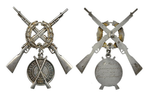 Комплект знаков и жетонов за отличную стрельбу, принадлежавших фельдфебелю Лейб-гвардии Павловского полка Ф.К.Евдокимову