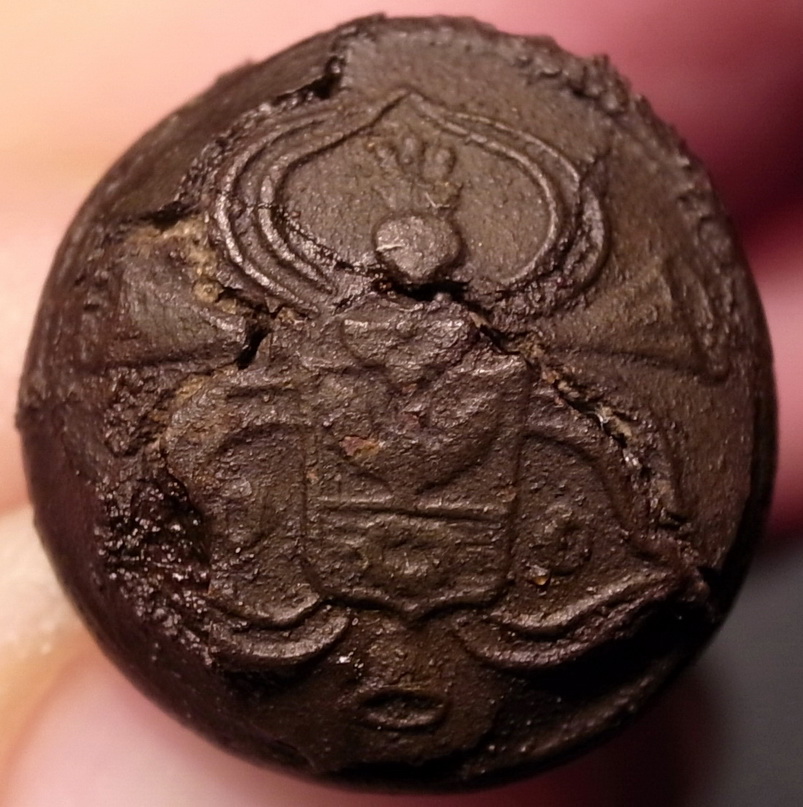 Пуговица ливрейного слуги. Герб, к сожалению, не определён. Встречается достаточно часто. Вот тут - в сохранности.